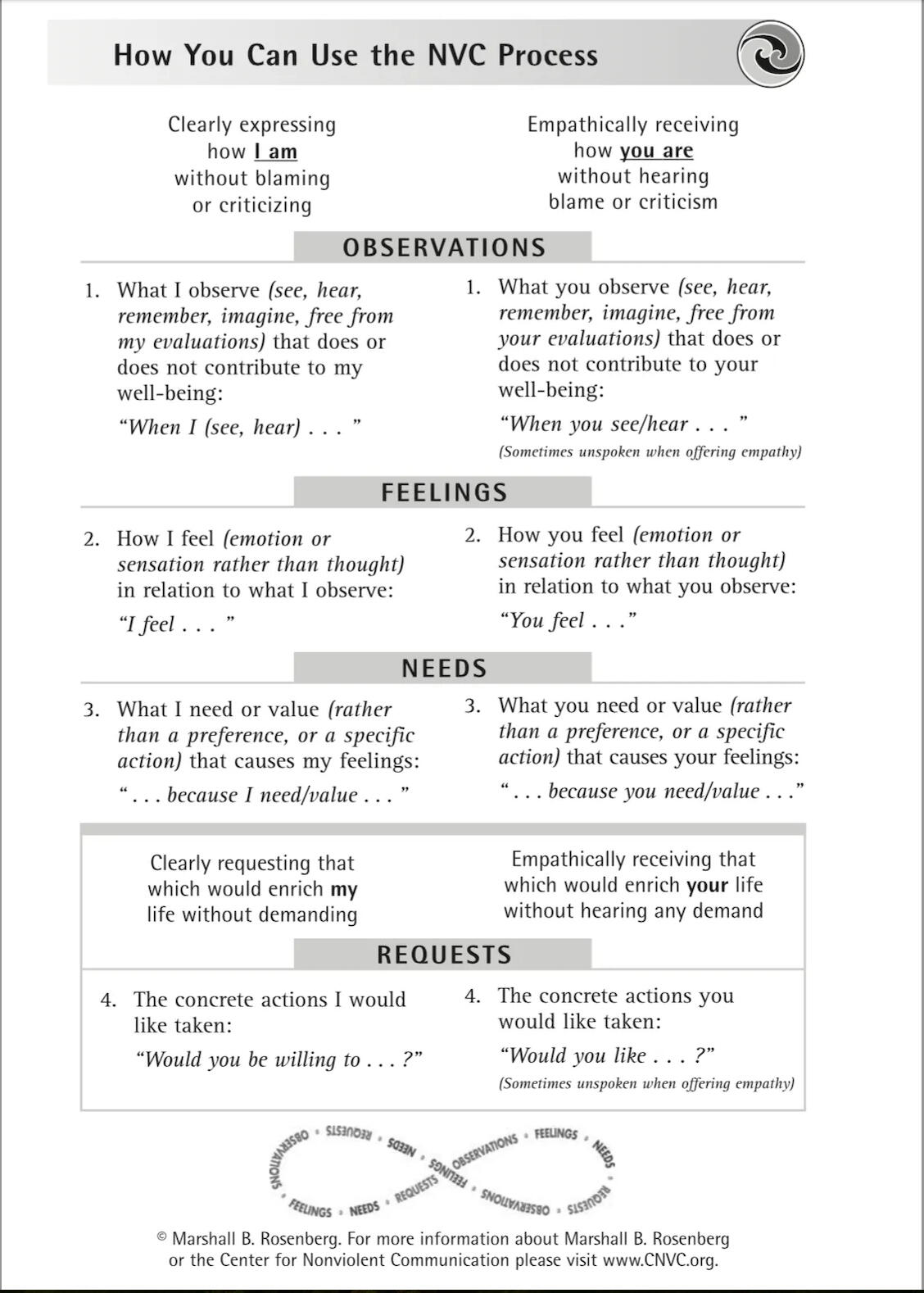 This is an excerpt from Marshal Rosenberg's brilliant book.He demonstrates a way of communicating which: when speaking reduces the risk that the other person will become defensive, and when listening helps to hear the message behind the words of someone who isn't communicating clearly.